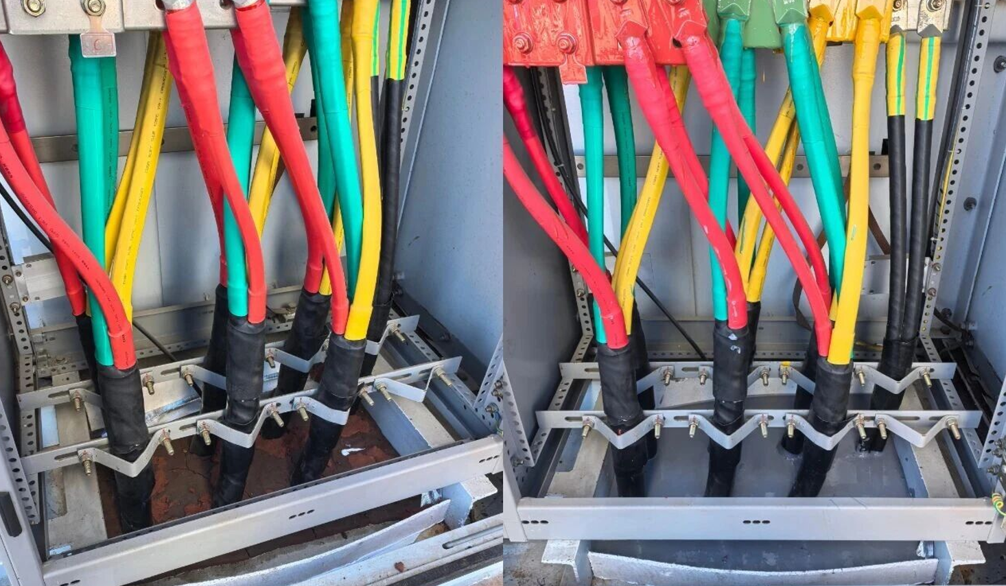 箱变作为风电系统核心设备,其运行安全直接影响整个风电项目的稳定运营,受潮、渗漏、绝缘老化等问题长期制约行业发展。结合牟平当地气候及设备实际情况,量身定制了底部封堵、母排防护、防凝露全方位解决方案,实现安全防护无死角,为行业同类项目提供了可复制的技术范本。 鑫合利打造了三大核心技术防护体系:底部封堵采用高分子耐火防潮材料,全方位阻隔潮气、渗漏及小动物侵入,筑牢设备安全第一道防线;母排涂刷阻燃导热纳米绝缘涂料,实现“绝缘+散热”双重保障,以材料创新提升设备能效与安全性;柜体内部采用超疏水涂料形成“荷叶效应”,从根源上解决凝露隐患,助力设备更好适应复杂环境。